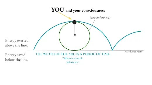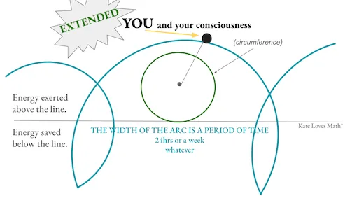 And that’s what I love about the concept of extended in the math world as it applies to circles (aka cycloids) and their attached generating point.When extended, sure, you’re consciously reaching far outside of yourself but there’s gonna be a balance that’s not only dictated, it’s just a cold hard mathematical fact: as long as you keep rolling along the line, it’ll come to pass that, cyclically, your extension is gonna dip below the line and save some energy before it extends – and expends – once again.