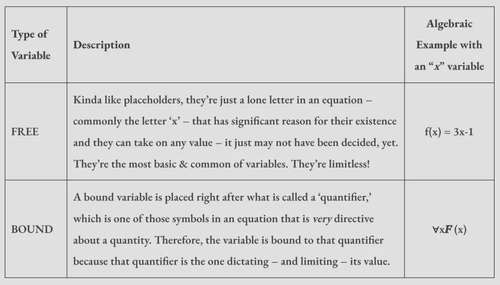 Variety IS the spice of life, y’all. It is more good than bad - no matter how much weight you put behind either of those words. Acknowledging and valuing the variables that exist in just about everything we do and (certainly) everyone we meet is how we all grow, personally and as a whole species; what a great ever-present opportunity that we all get to experience. It makes sense to me to identify - and understand - the value of the variable in the specific conditions you are in; are they free (as a valid placeholder yet currently with unknown value), or are they bound (to a quantifier -- and is that quantifier you)?